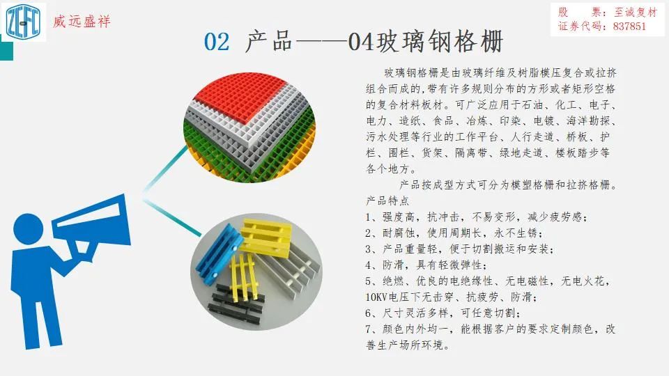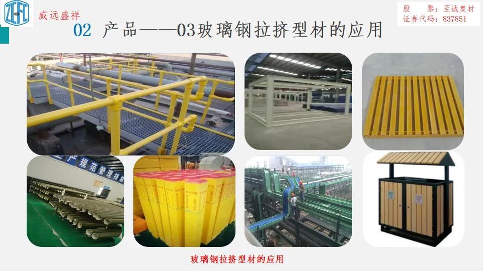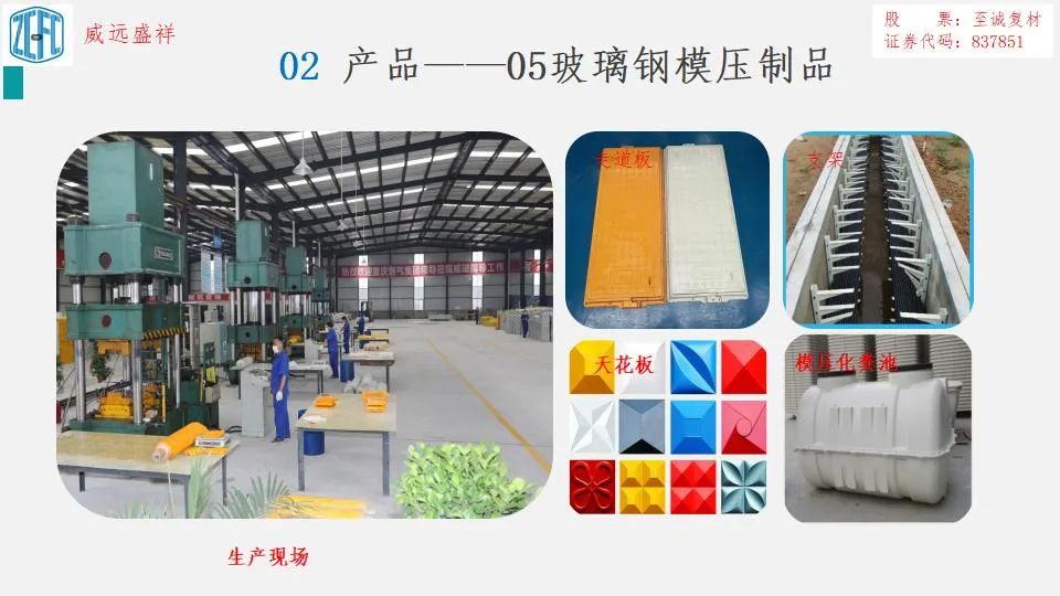公司主要产品有:各类FRP拉挤型材(FRP护栏、矩管、方管、槽钢、工字钢以及各种异型型材等)、FRP电缆桥架(槽式桥架、梯式桥架、托盘式桥架),FRP模塑格栅(#25、#30、#38、#50)、FRP板材(各类有机/无机的屋面瓦、车厢板)、SMC/BMC模压制品(水电气表箱,充电桩、天花板吊顶、电力盖板、电缆支架、冷却塔板、变电站等),改性工程塑料(增强玻纤塑料),综合产能超过10万吨,其中燃气表箱及水表箱的年生产能力达数十万只。公司拥有自己的安装队伍,具备各种玻璃钢设备的安装能力,并能根据施工要求现场制作多规格型号的玻璃钢制品。公拥有玻璃纤维布、毡、多轴向织物几十台套设备,规格齐全。