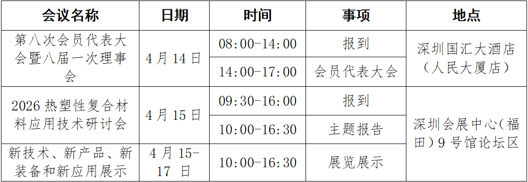 本次大会将与“2026热塑性复合材料应用技术研讨会”同期举办,并依托“第四届深圳国际复合材料工业技术展览会”(2026年4月15-17日)的平台优势,旨在汇聚行业智慧,共探产业智能化、绿色化、融合化发展新路径,为会员单位提供深度交流、共谋发展的广阔平台。诚挚邀请各会员单位积极参与,共商行业创新发展大计。