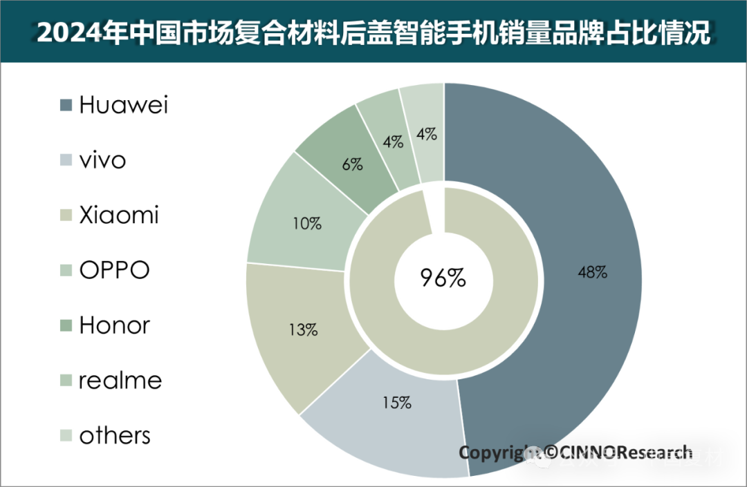 2024年,中国智能手机复合材料后盖销量品牌TOP6(华为、vivo、小米、OPPO、荣耀、真我)合计市占率达96%,但同比下滑4个百分点,主要受摩托罗拉等品牌份额增长的冲击。各品牌技术路径呈现显著差异化: