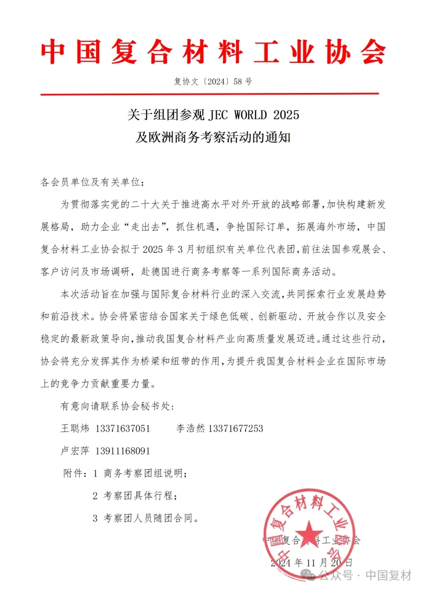 为贯彻落实党的二十大关于推进高水平对外开放的战略部署,加快构建新发展格局,助力企业“走出去”,抓住机遇,争抢国际订单,拓展海外市场,中国复合材料工业协会拟于 2025年3月初组织有关单位代表团,前往法国参观展会、客户访问及市场调研,赴德国进行商务考察等一系列国际商务活动。本次活动旨在加强与国际复合材料行业的深入交流,共同探索行业发展趋势和前沿技术。协会将紧密结合国家关于绿色低碳、创新驱动、开放合作以及安全稳定的最新政策导向,推动我国复合材料产业向高质量发展迈进。通过这些行动,协会将充分发挥其作为桥梁和纽带的作用,为提升我国复合材料企业在国际市场上的竞争力贡献重要力量。中国复合材料工业协会